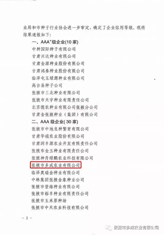 | 熱烈祝賀張掖市多成農(nóng)業(yè)有限公司被評為2017年度信用等級AAA級企業(yè)! | ||